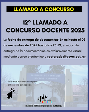 AVISO IMPORTANTE: Se establece la fecha de entrega de documentación a partir de la fecha de publicación hasta el 06 de noviembre del año académico 2025, el modo de entrega de la documentación es exclusivamente virtual, mediante correo electrónico a rectorado@ifdcvm.edu.ar.