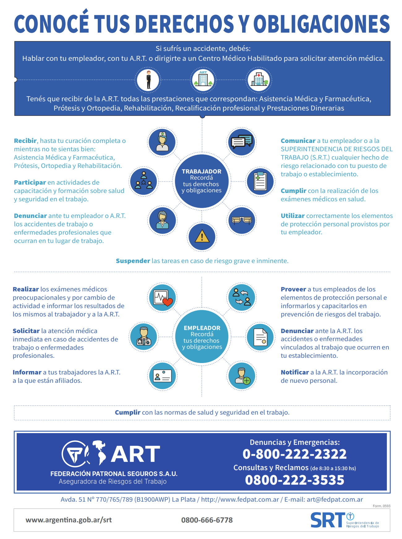Recuerde que el accidentado siempre debe concurrir con el formulario de Denuncia de Accidente para su correcta atención. Asimismo, deberá remitir el duplicado de la misma, antes de las 48 horas de ocurrido el siniestro a cualquiera de nuestras sucursales, oficinas de vuestro asesor de seguros o vía e-mail a denunciasart@fedpat.com.ar