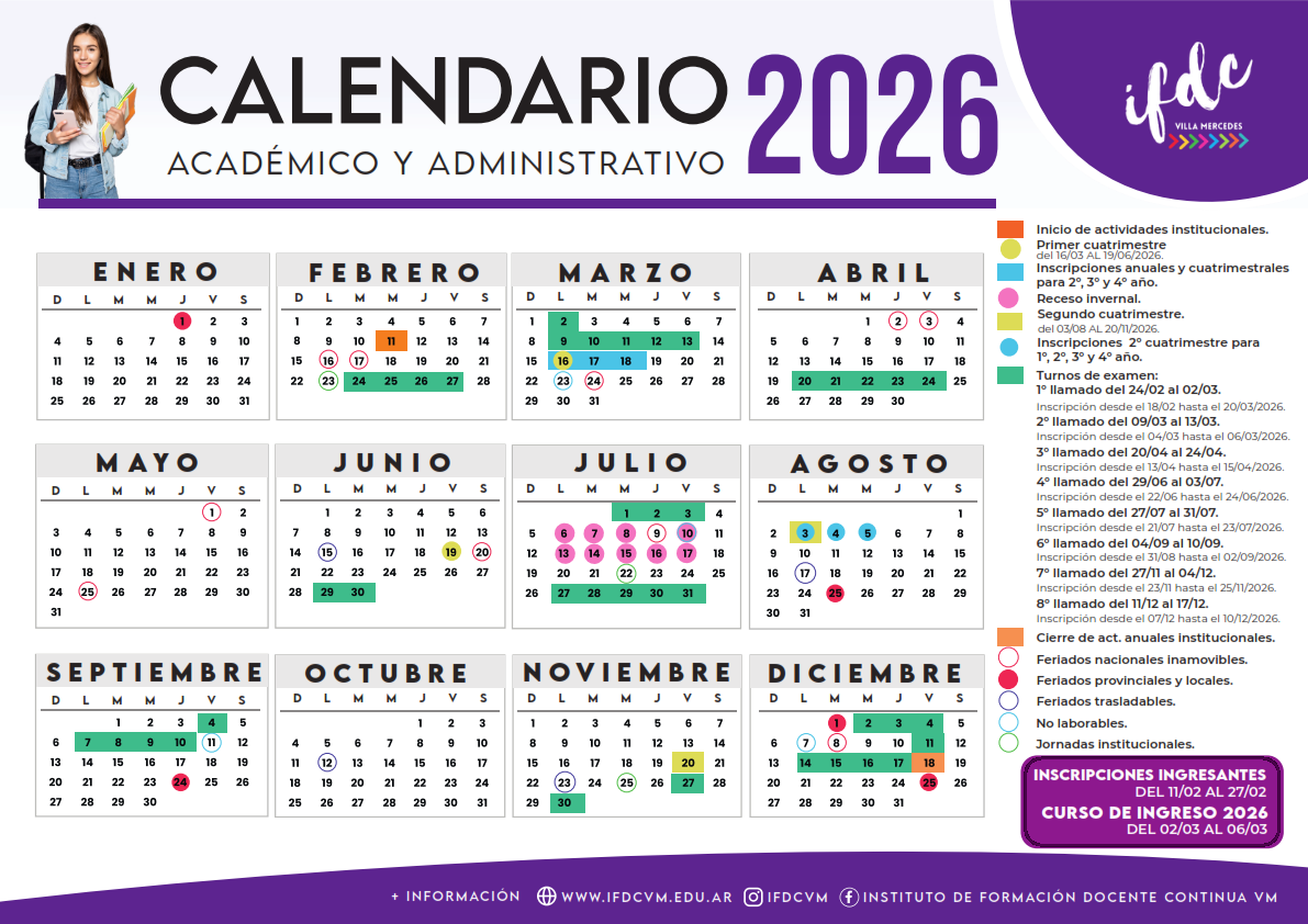 El calendario académico es el sistema que utilizamos en nuestro instituto para ordenar las actividades académicas a lo largo del ciclo lectivo (inscripciones a las carreras, a las materias, fechas de exámenes finales, principio y fin de cada cuatrimestre, entre otros), regulado según lo establecido en la Resolución Académica N° 165/2025, al cual podrás acceder ingresando al siguiente enlace.