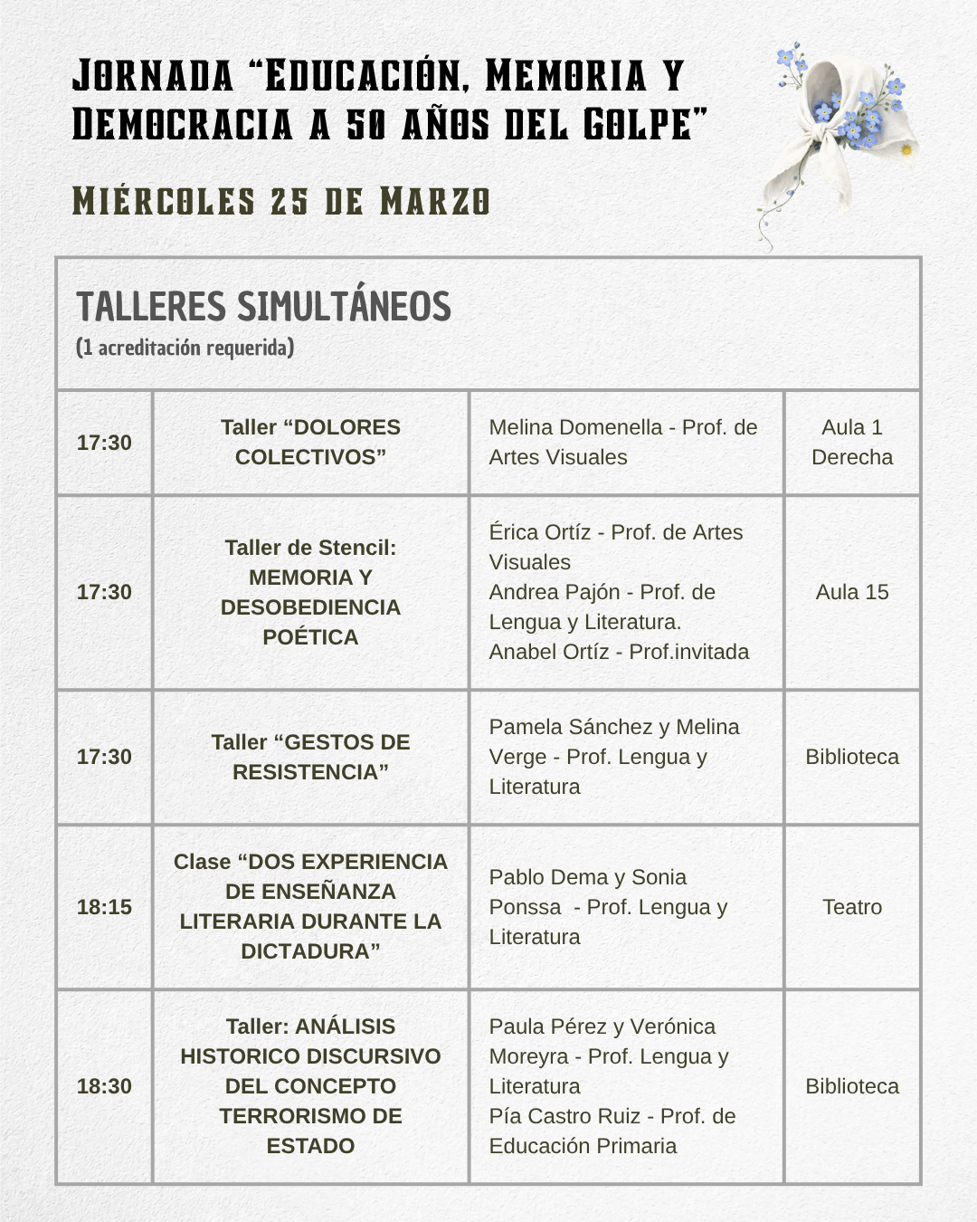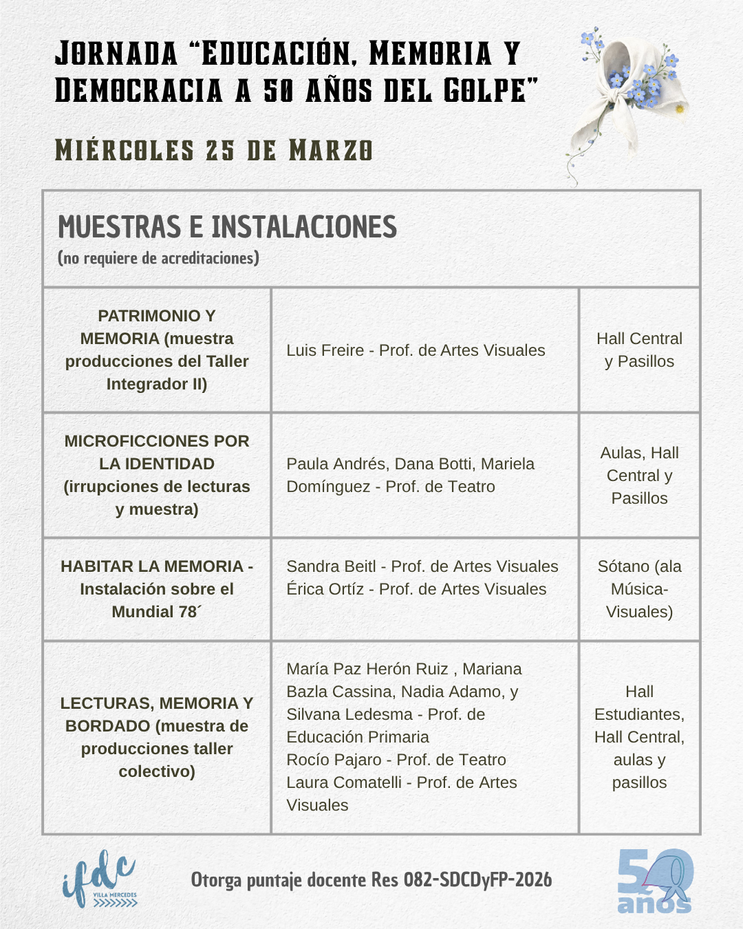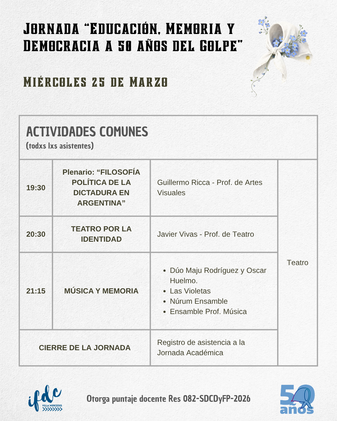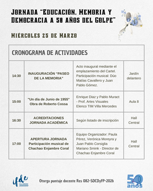 Jornada «Educación, Memoria y Democracia a 50 años del Golpe» 20 marzo, 2026 por Mariano Guillermo Villegas Resolución N° 82-SDCDyFP-2026 CRONOGRAMA DE ACTIVIDADES TALLERES SIMULTÁNEOS MUESTRAS E INSTALACIONES ACTIVIDADES COMUNES DESCARGAR EL CRONOGRAMA COMPLETO DESDE AQUÍ EN FORMATO PDF